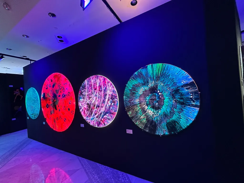 The exhibition features nearly 100 original works, each rooted in Hart’s pioneering discipline of “vibrational expressionism,” a method that transforms the invisible mechanics of sound into tangible visual compositions. These are not conventional paintings. They are the direct result of sonic energy—created through the physical act of drumming and the resulting frequencies that ripple across unconventional surfaces including drumheads, cymbals, metal plates, and plexiglass. What emerges is a body of work that captures motion without freezing it, energy without diluting it, and rhythm without reducing it to abstraction.